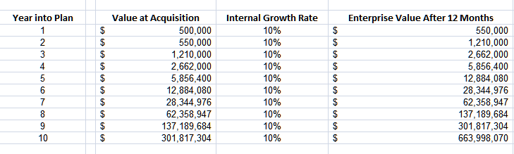 Assume that you begin with a single company valued at $500k. Then assume a consistent internal growth rate of 10% every year. On top of that comes the growth from doing a single acquisition per year that doubles your enterprise value.